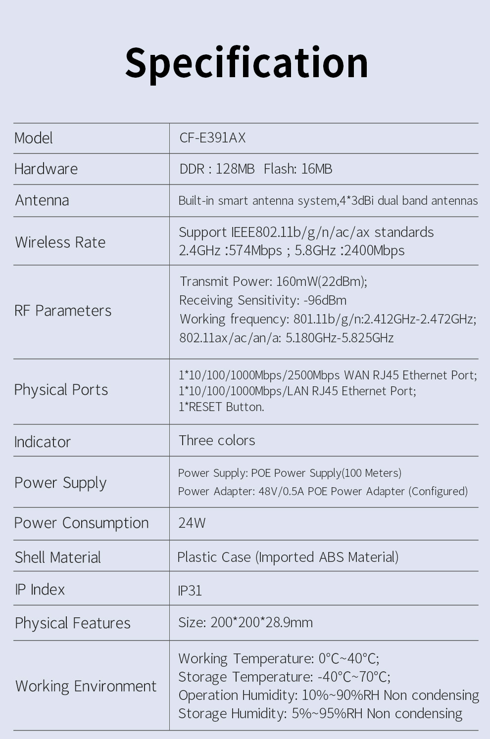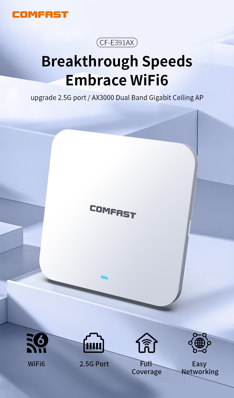 The CF-E391AX is a WiFi 6 ceiling mount AP with a 2.5G port, delivering high-speed, stable wireless coverage for large indoor spaces. It supports dual-band high-speed connectivity and Mesh networking for seamless roaming and wide coverage, and uses standard PoE for easy installation. It is suitable for various venues including malls, hotels, enterprises, and schools.