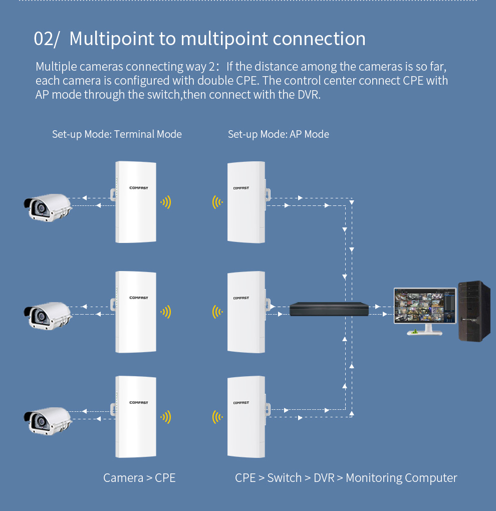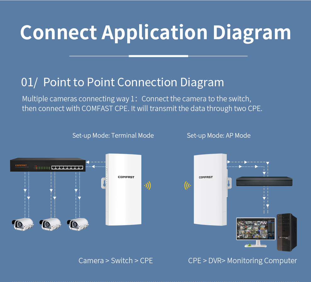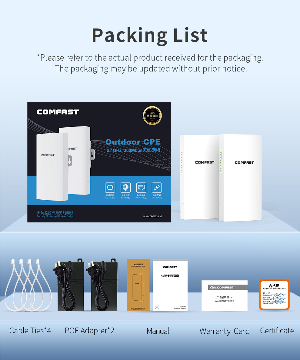 The CF-E112N V2 is a high-power 300Mbps outdoor wireless bridge designed for harsh environments. Operating on the 2.4GHz band, it delivers stable, long-range signal transmission for applications like security surveillance. Featuring PoE support for flexible installation and robust protection against water, lightning, and vibration across a wide temperature range, it’s the ideal solution for outdoor projects in elevators, plazas, parking lots, and more.