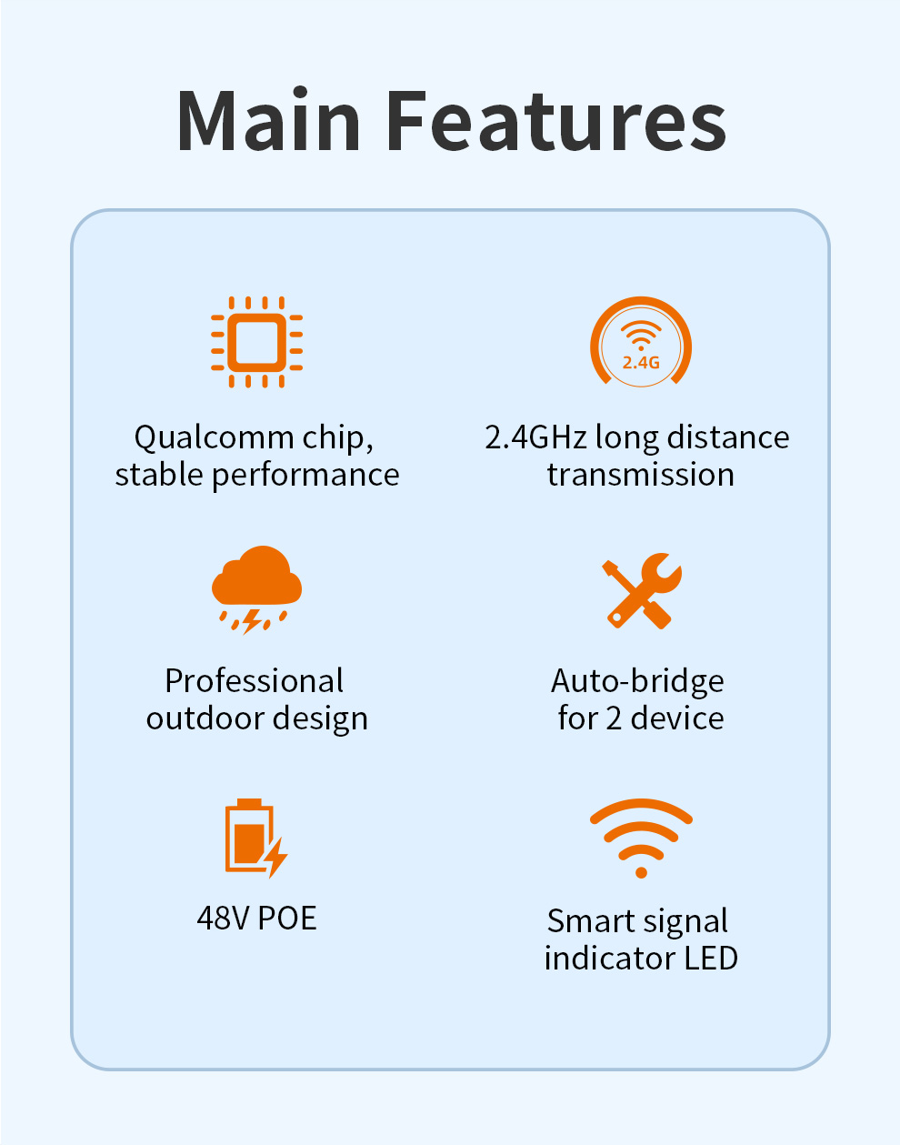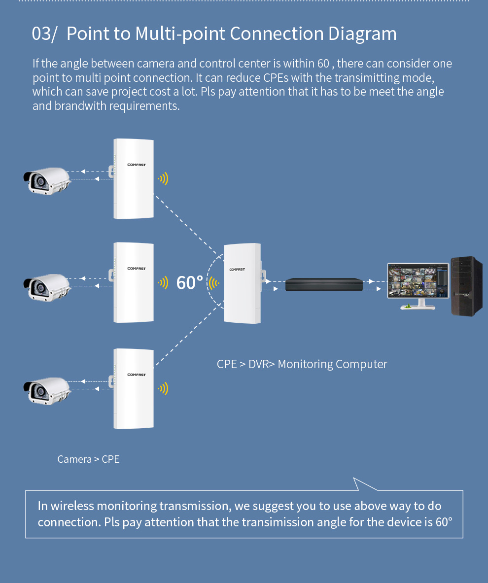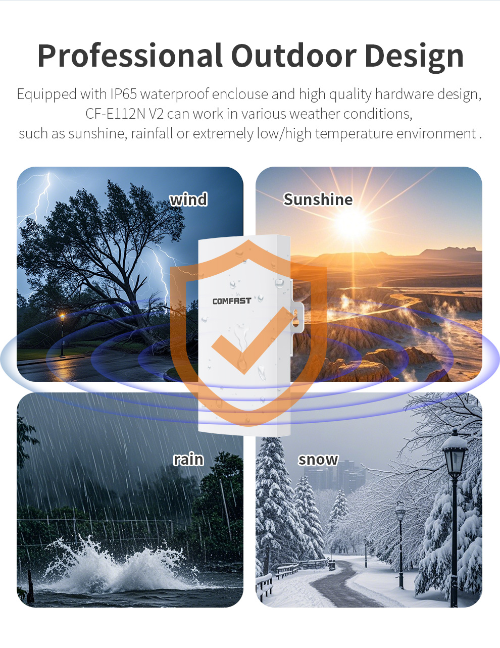 The CF-E112N V2 is a high-power 300Mbps outdoor wireless bridge designed for harsh environments. Operating on the 2.4GHz band, it delivers stable, long-range signal transmission for applications like security surveillance. Featuring PoE support for flexible installation and robust protection against water, lightning, and vibration across a wide temperature range, it’s the ideal solution for outdoor projects in elevators, plazas, parking lots, and more.
