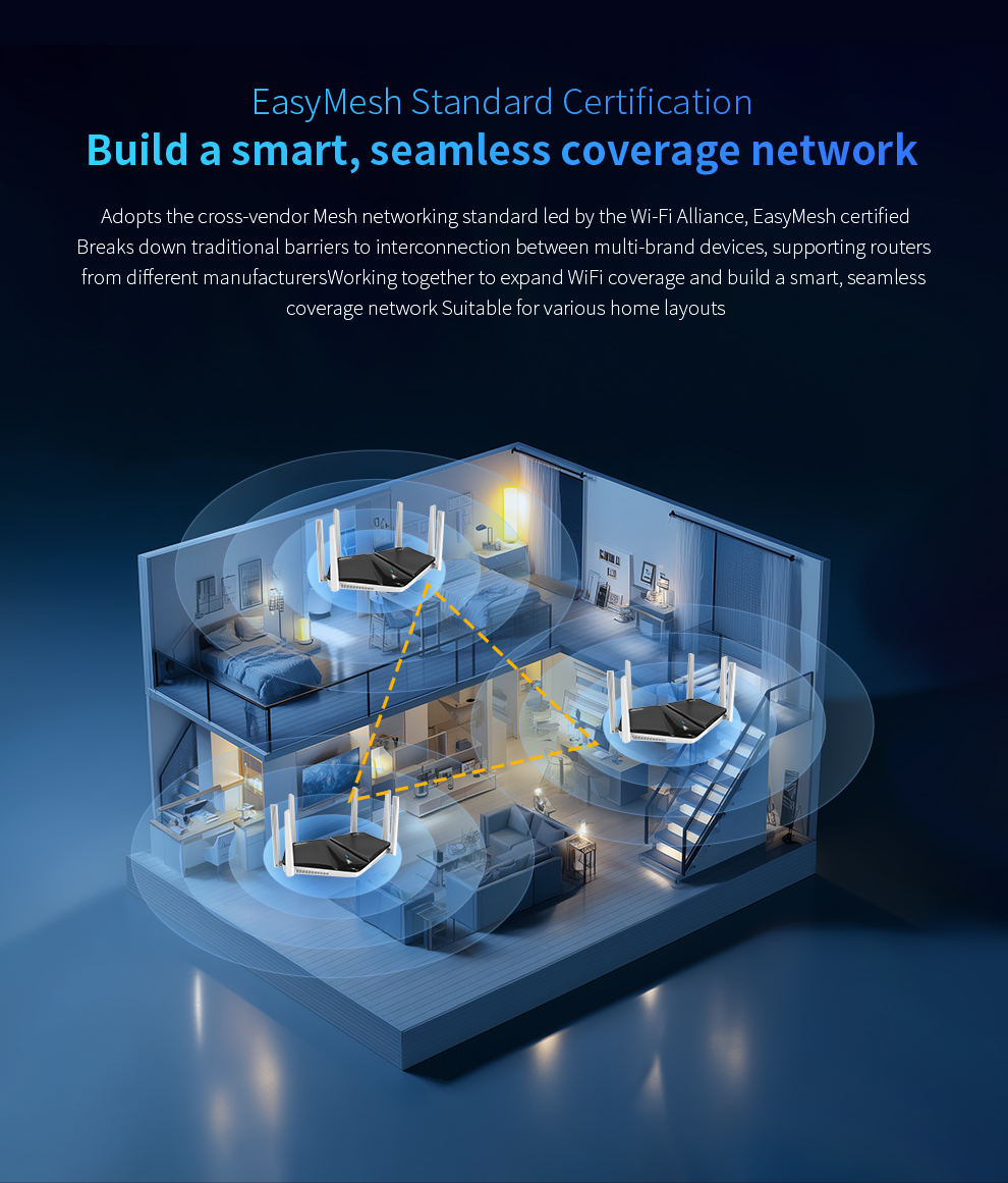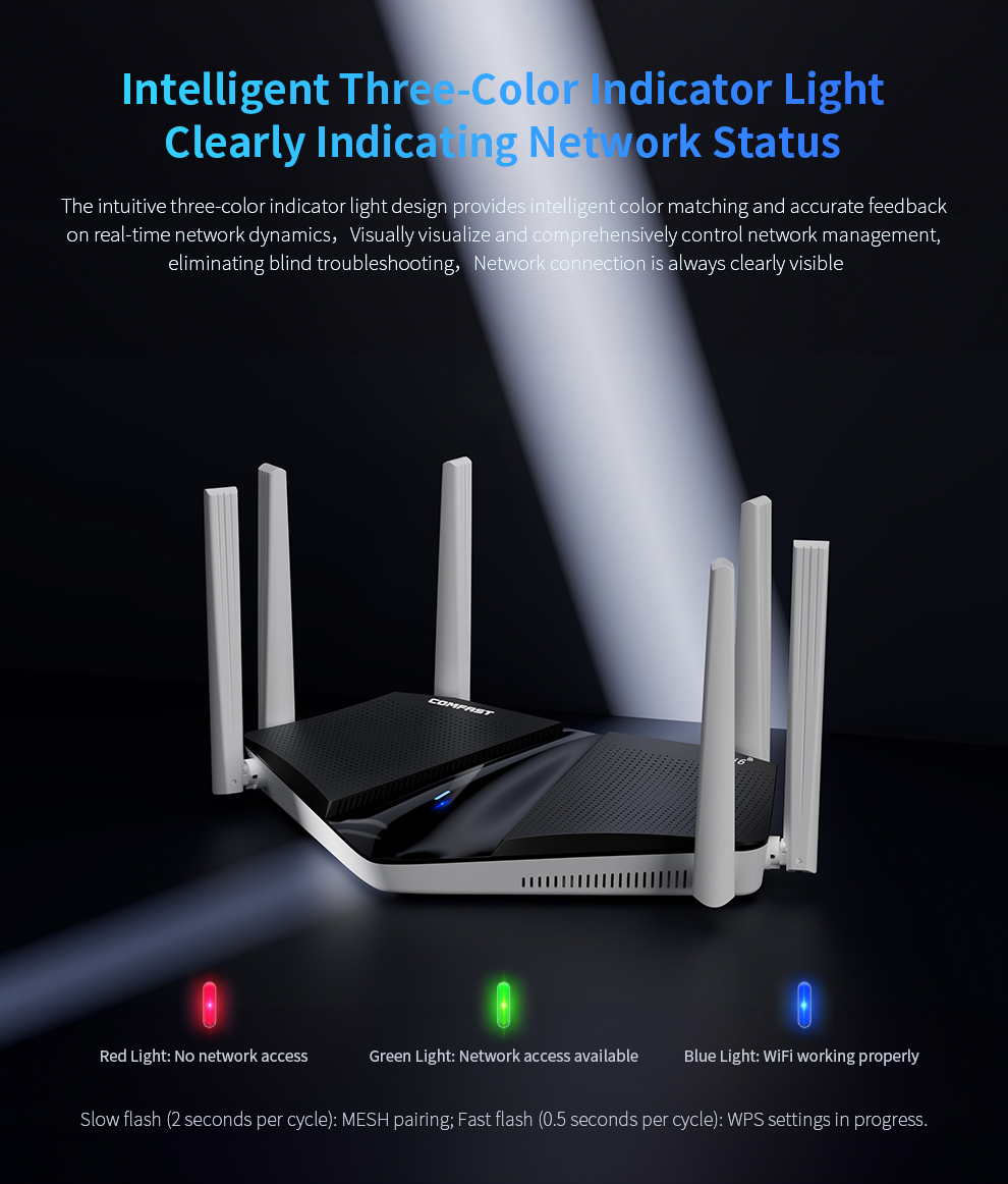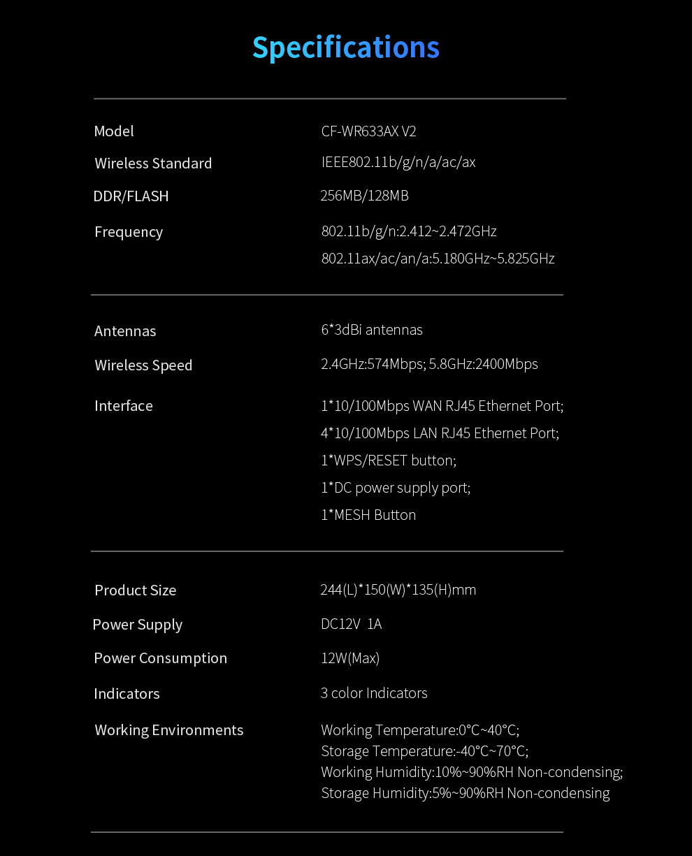 CF-WR633AX V2 is a high-power WiFi 6 smart Mesh router designed for fast, seamless whole-home coverage. Equipped with a 2.5G Ethernet port, it easily supports gigabit-plus broadband. With built-in Mesh functionality and one-click pairing, it delivers reliable network coverage for large homes and complex layouts.