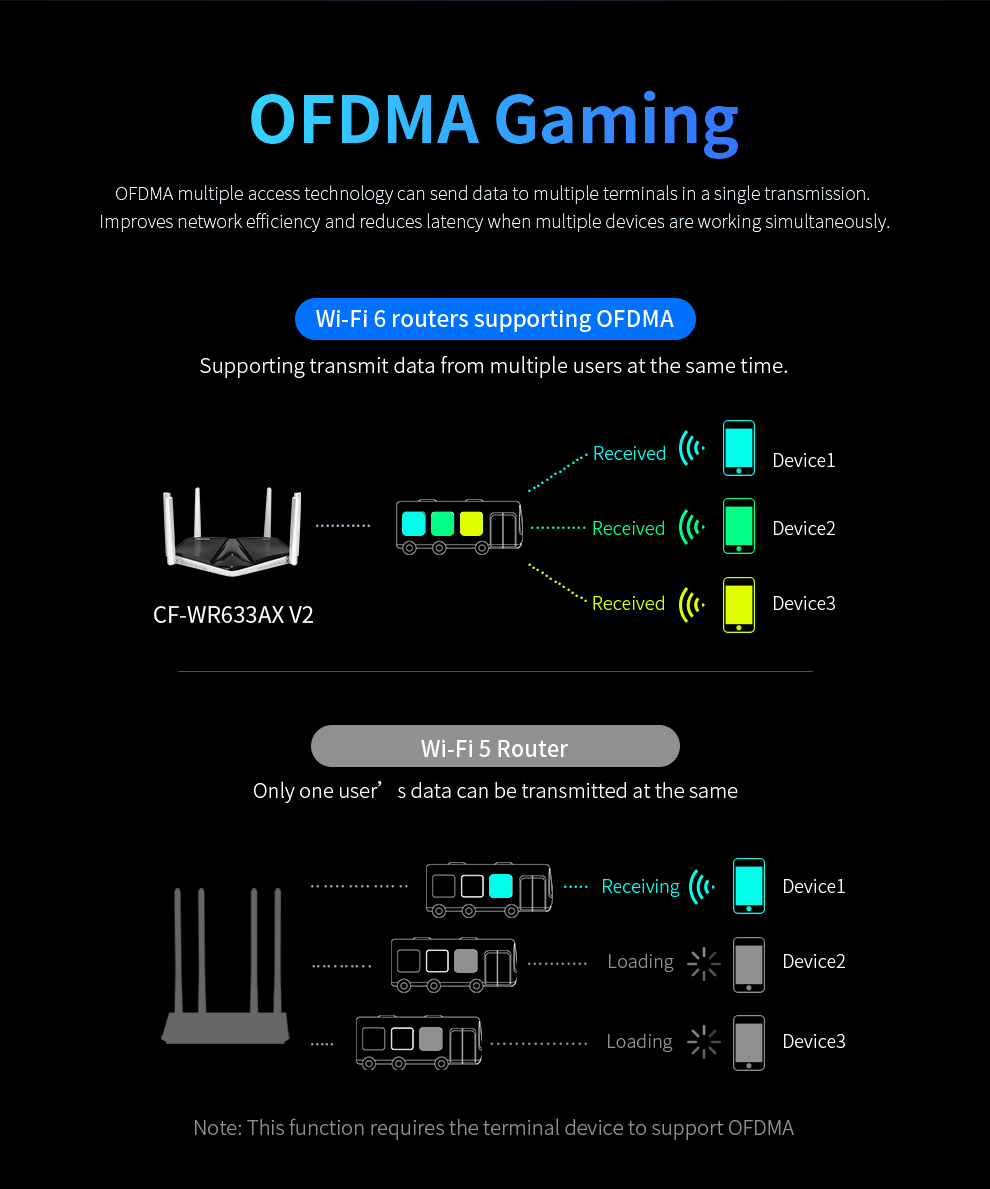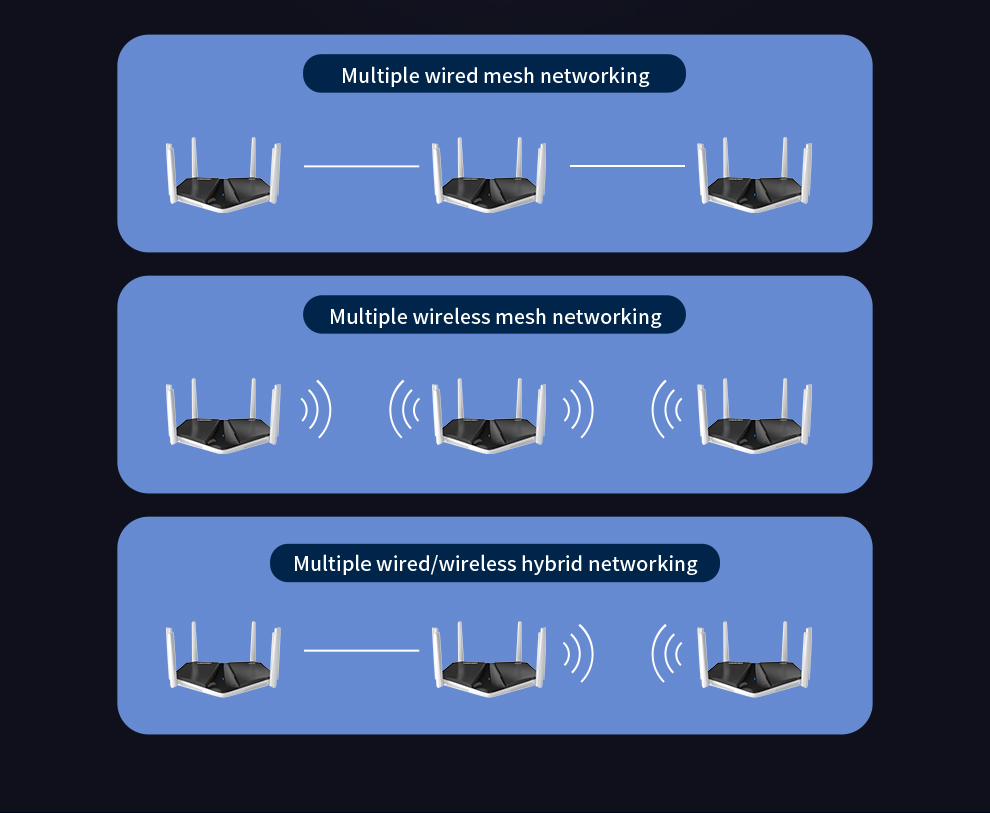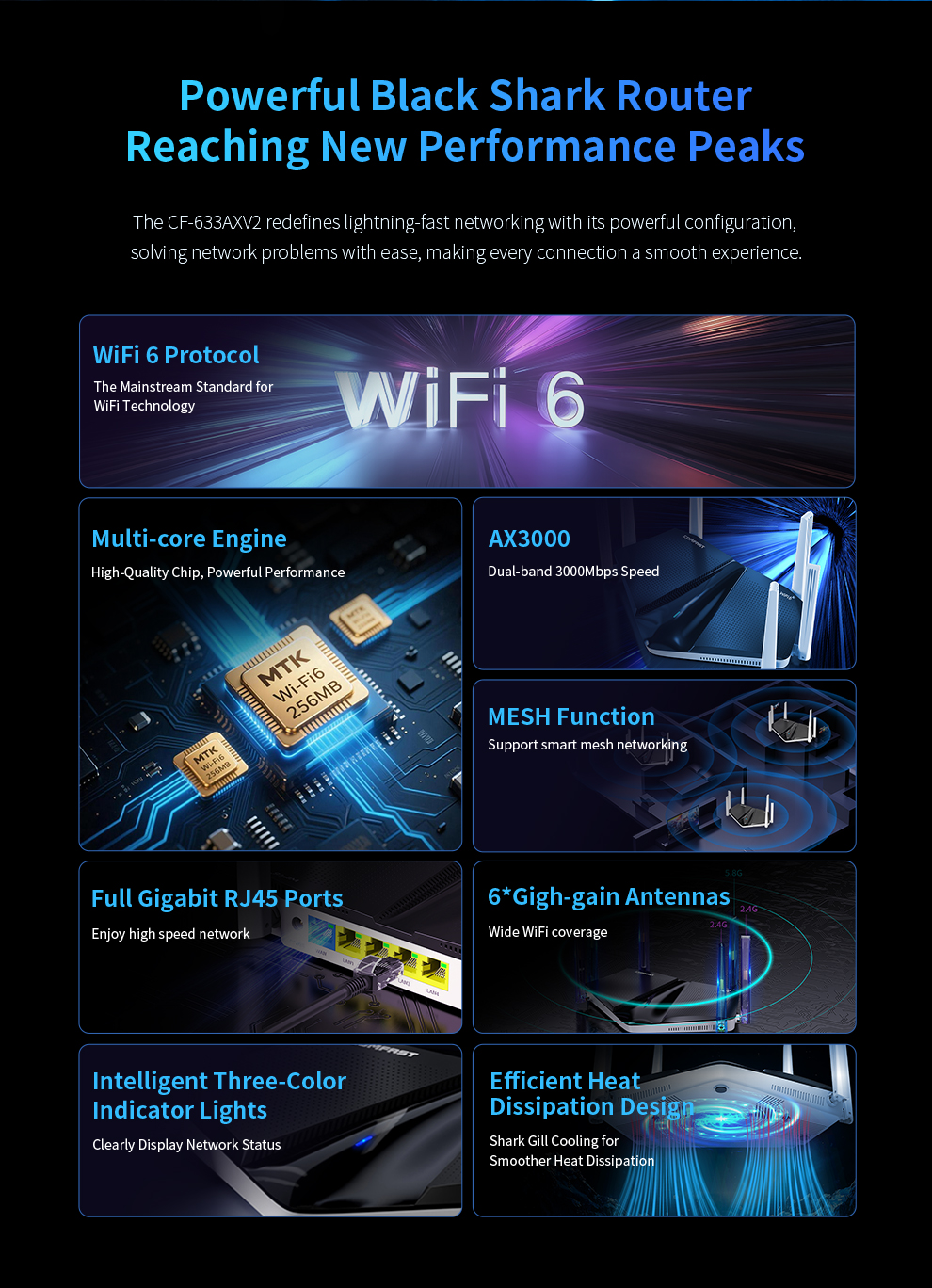 CF-WR633AX V2 is a high-power WiFi 6 smart Mesh router designed for fast, seamless whole-home coverage. Equipped with a 2.5G Ethernet port, it easily supports gigabit-plus broadband. With built-in Mesh functionality and one-click pairing, it delivers reliable network coverage for large homes and complex layouts.