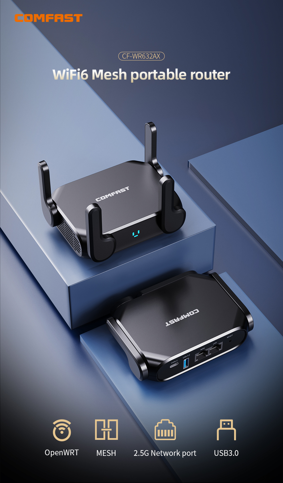 The CF-WR632AX is a WiFi 6 portable Mesh router with a wireless speed of up to 3000Mbps. It delivers high bandwidth, low latency, high efficiency, and extensive coverage, featuring a sleek and compact design that ensures seamless network coverage across various scenarios—including home, office, and complex environments.