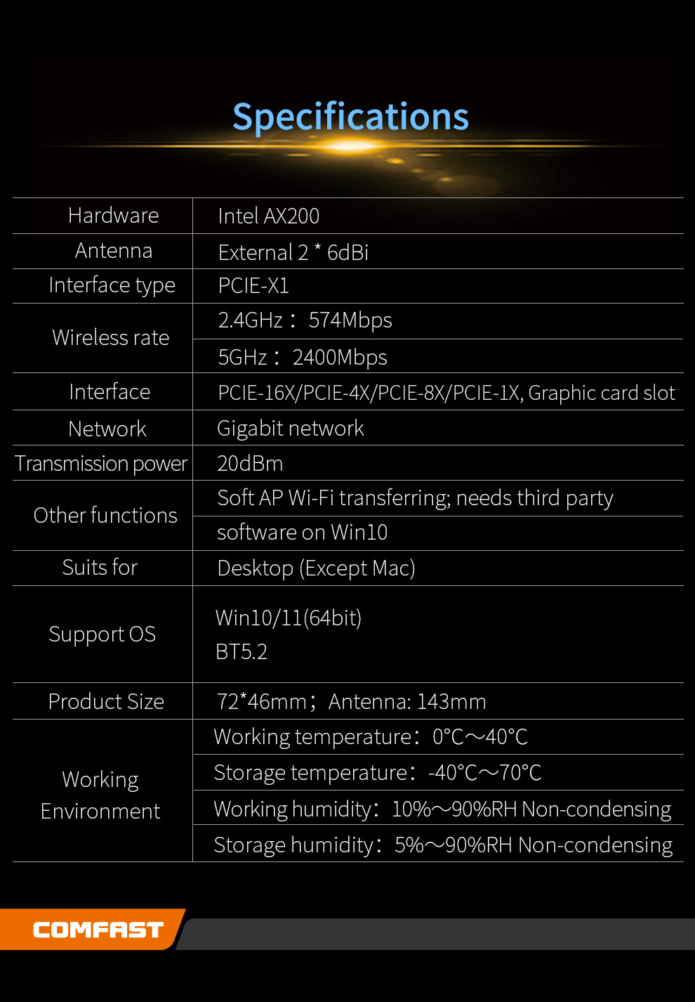 CF-AX200 is a high-speed PCI-E network card supporting the latest WiFi 6 (802.11ax) standard. It delivers dual-band 2.4GHz and 5.8GHz performance with wireless speeds up to 2974Mbps and includes Bluetooth 5.2 for enhanced connectivity. With strong specifications and practical features, it meets the higher performance needs of users.