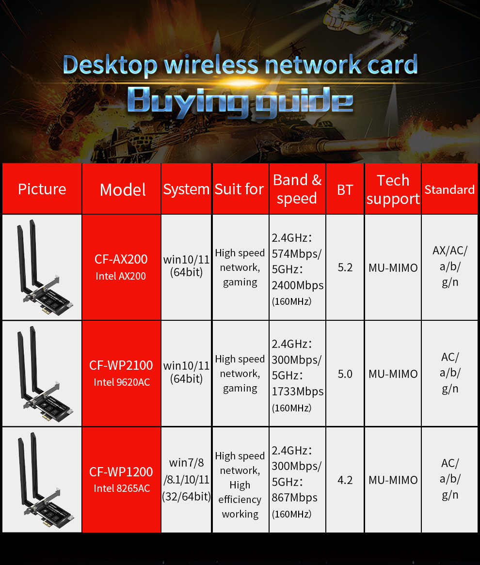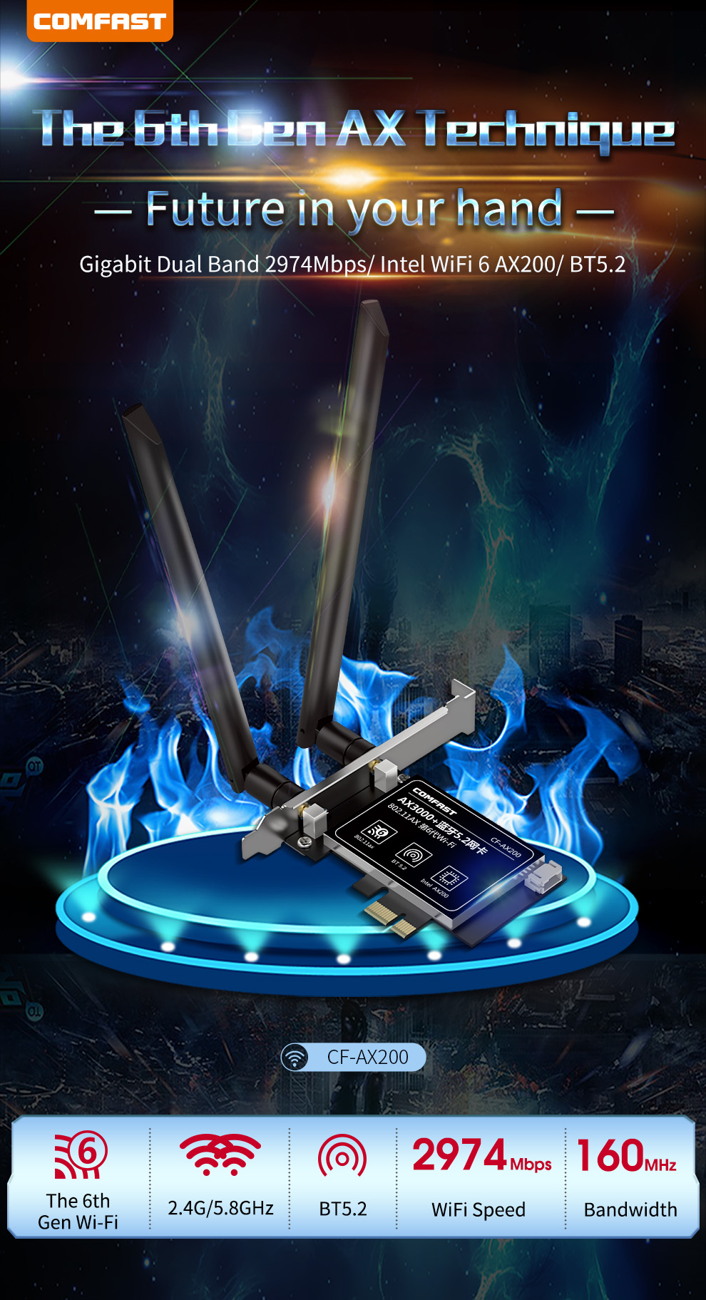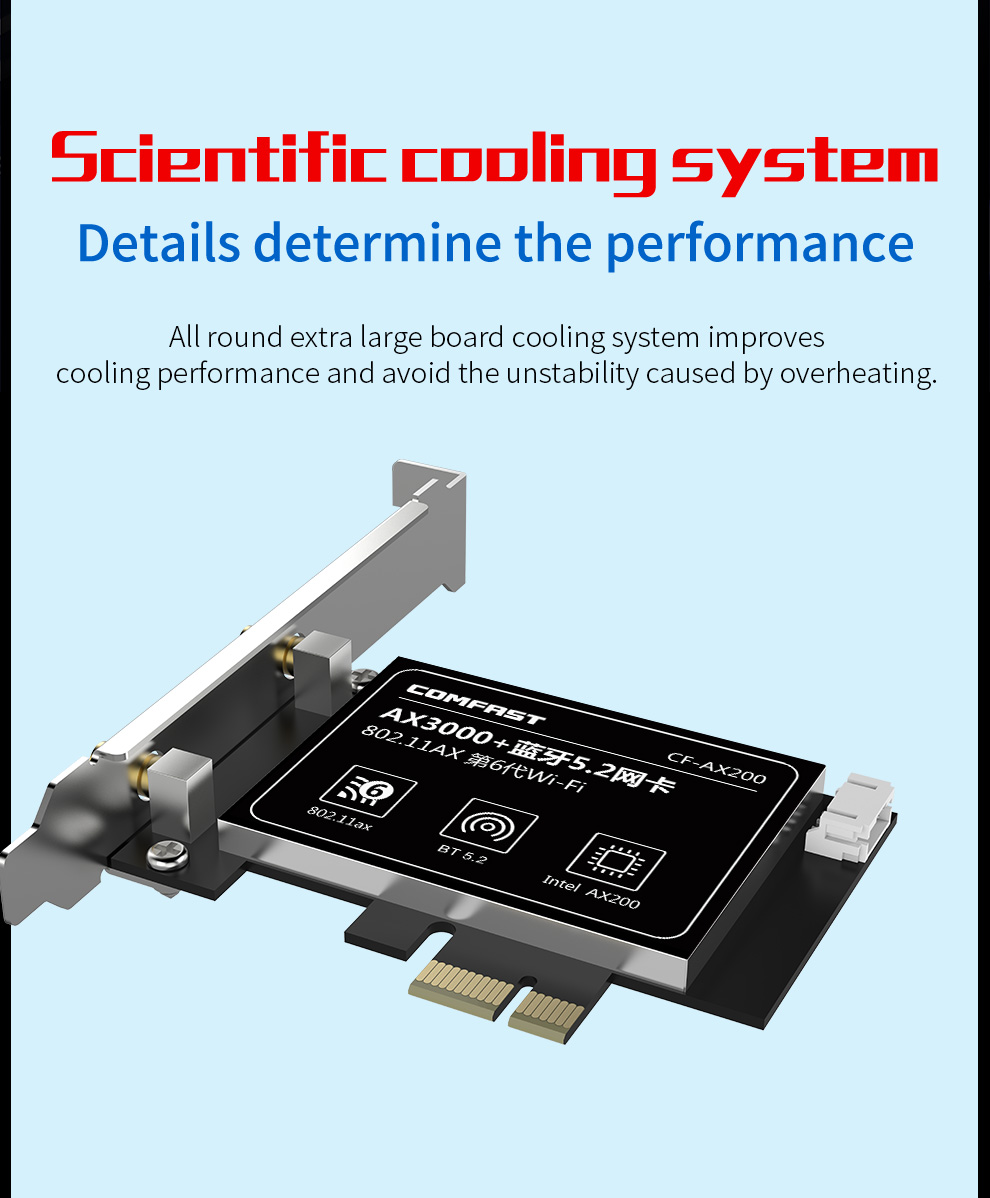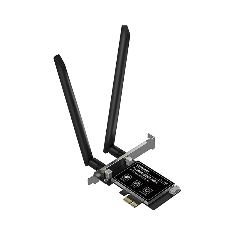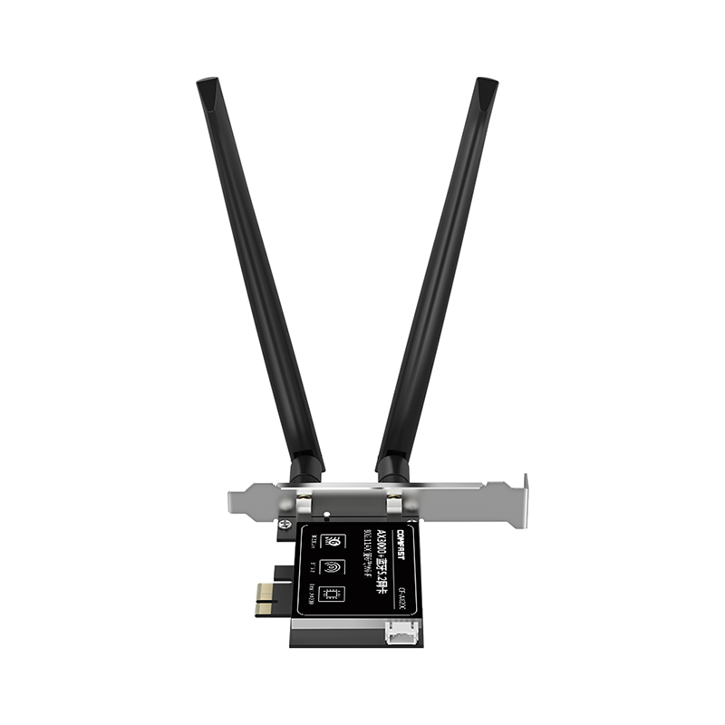 CF-AX200 is a high-speed PCI-E network card supporting the latest WiFi 6 (802.11ax) standard. It delivers dual-band 2.4GHz and 5.8GHz performance with wireless speeds up to 2974Mbps and includes Bluetooth 5.2 for enhanced connectivity. With strong specifications and practical features, it meets the higher performance needs of users.