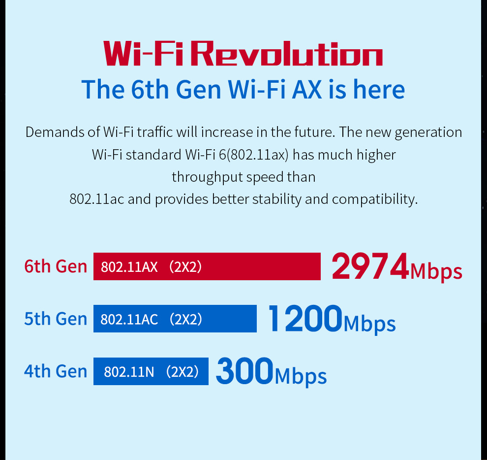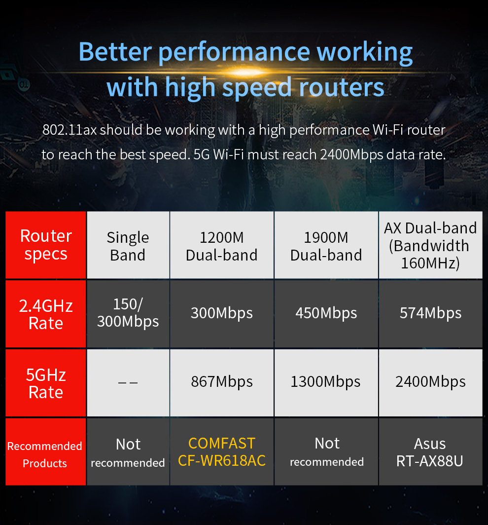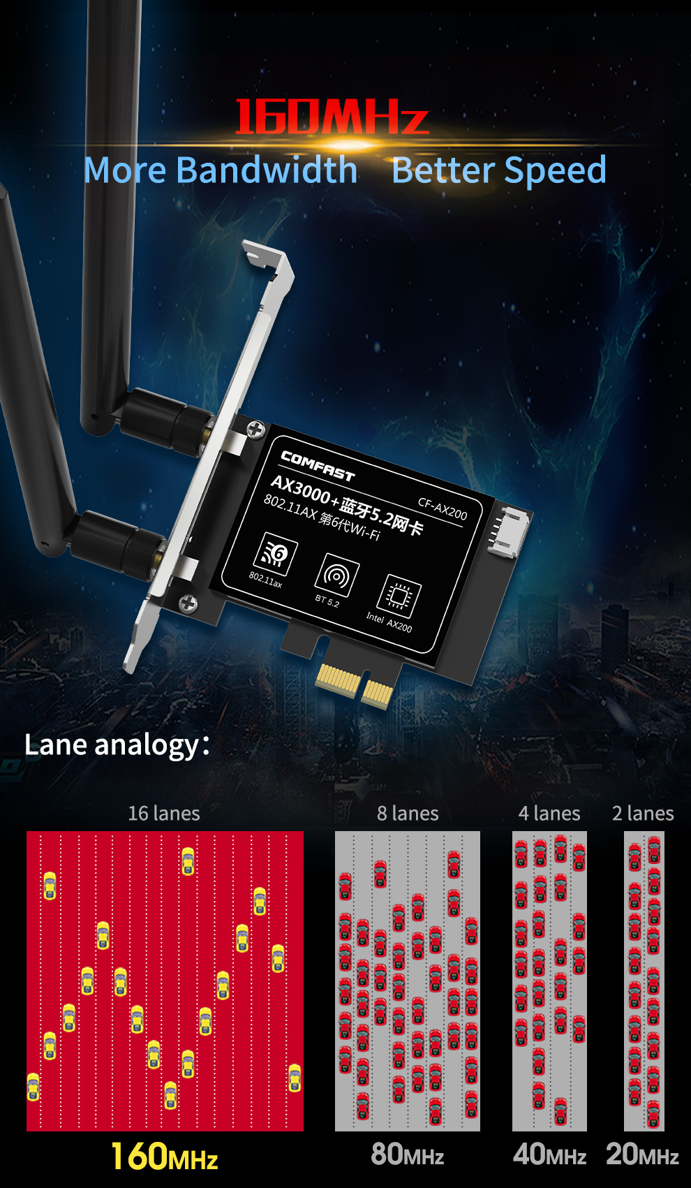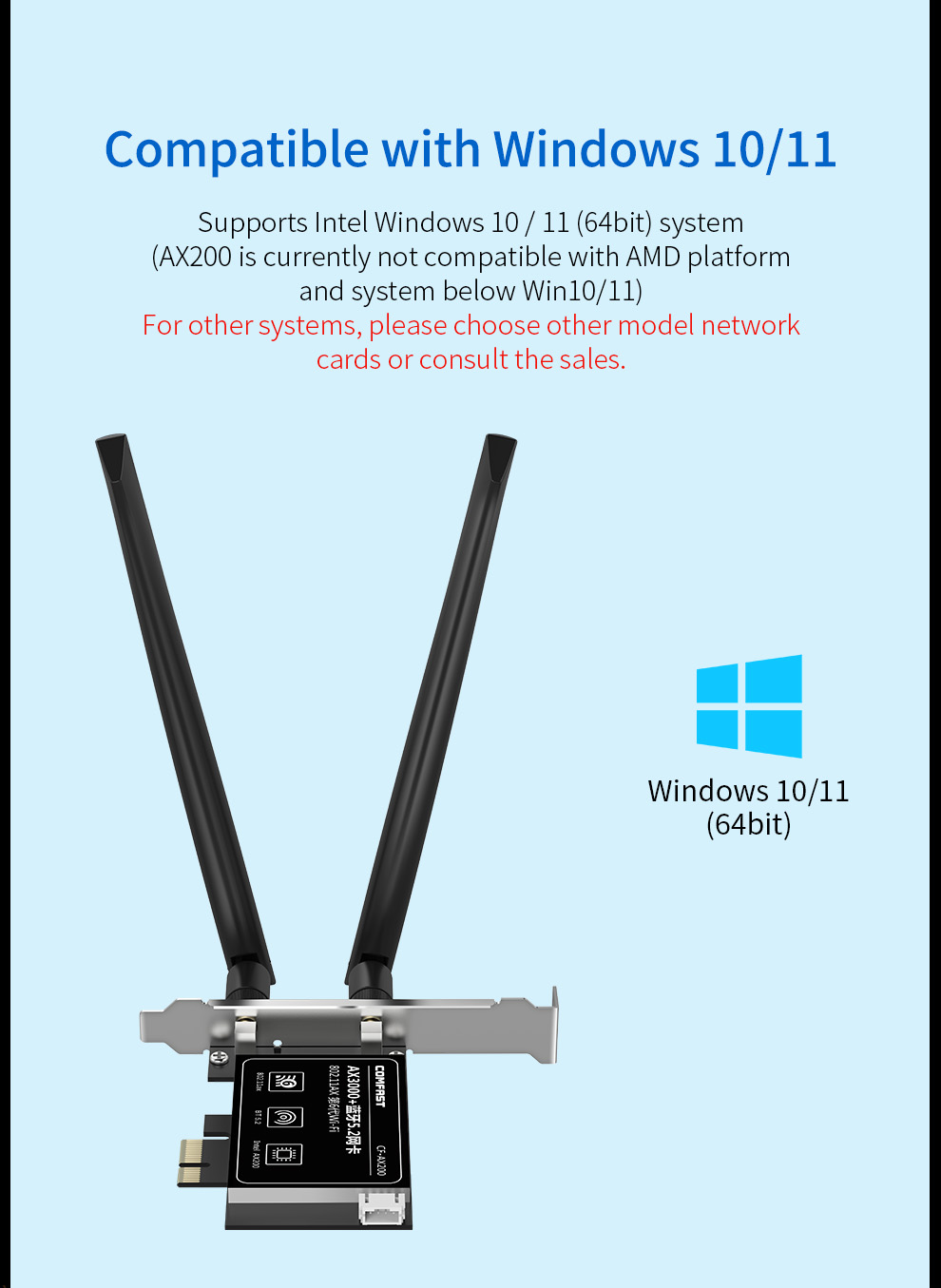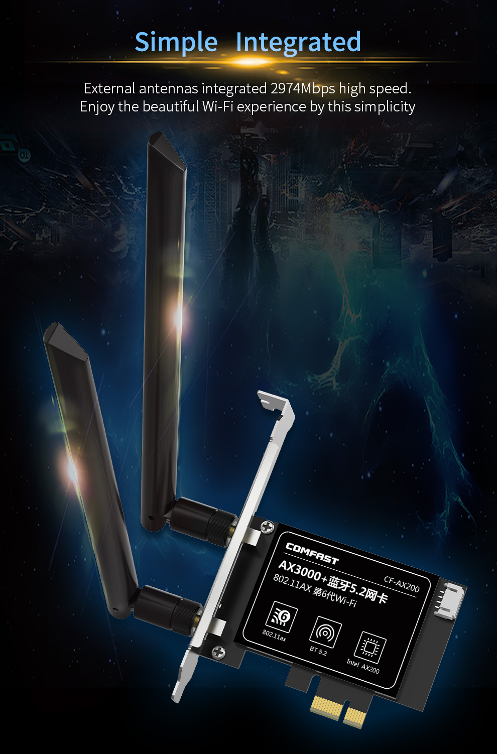CF-AX200 is a high-speed PCI-E network card supporting the latest WiFi 6 (802.11ax) standard. It delivers dual-band 2.4GHz and 5.8GHz performance with wireless speeds up to 2974Mbps and includes Bluetooth 5.2 for enhanced connectivity. With strong specifications and practical features, it meets the higher performance needs of users.