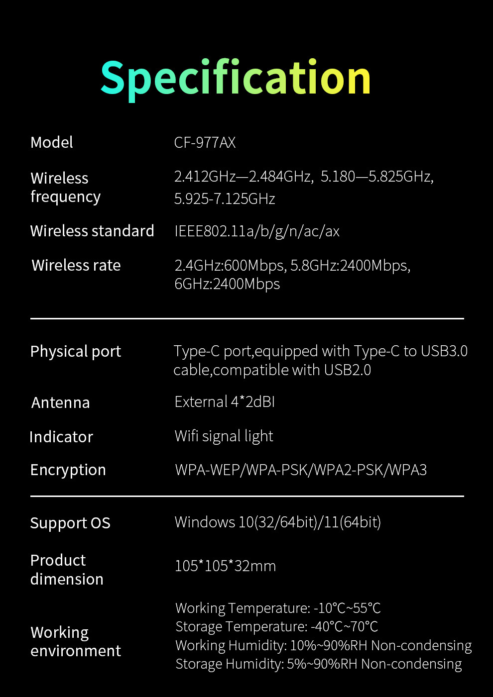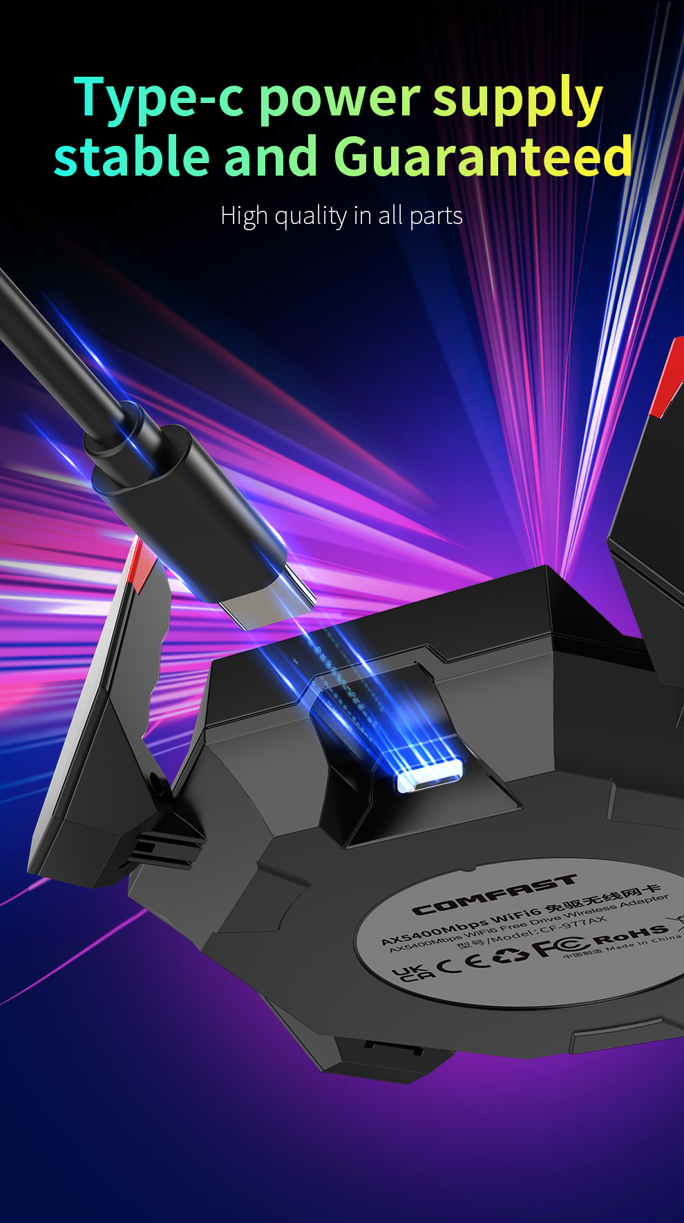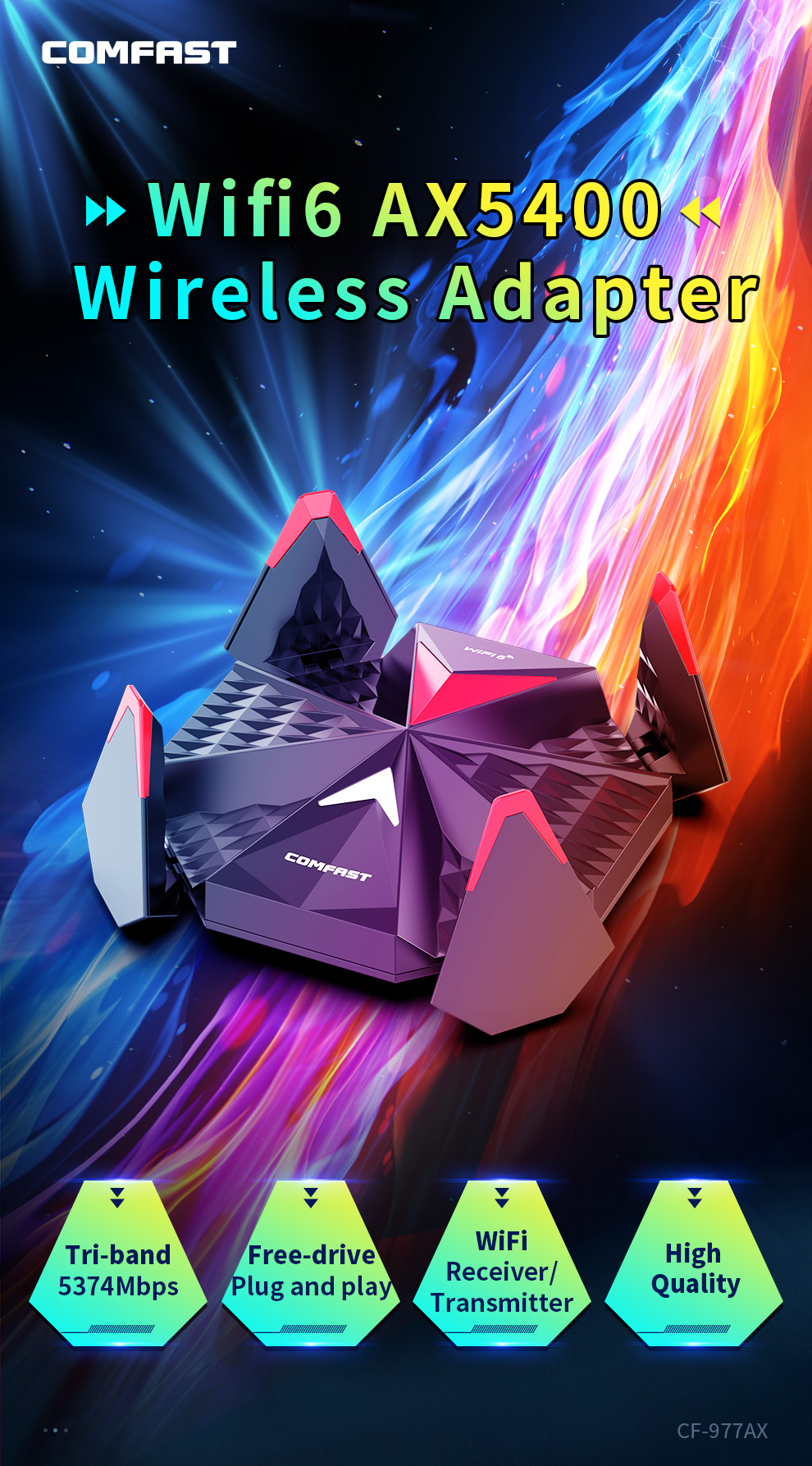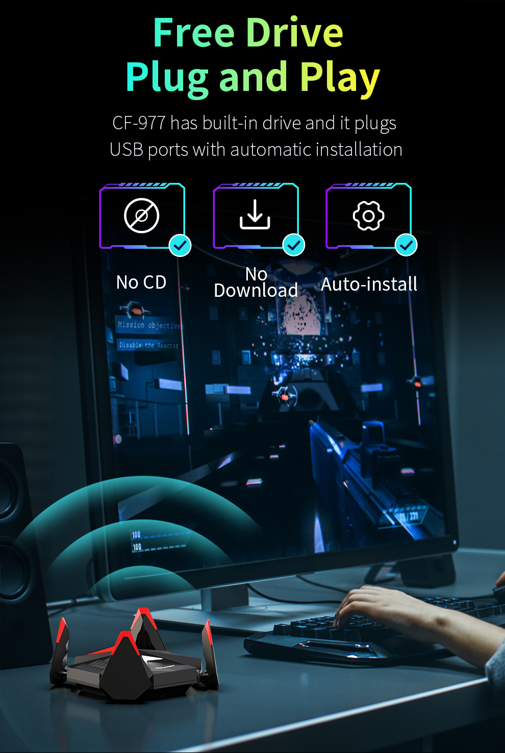 The CF-977AX is a driver-free tri-band WiFi6 adapter engineered for gaming, delivering blazing speeds up to 5374Mbps. It dramatically optimizes latency and interference for fluid, responsive gameplay in congested networks. Equipped with four external antennas for strong signals and a Type-C port with an extension cable for flexible placement, its plug-and-play design offers wide compatibility, making it a powerful upgrade for gaming and high-performance networks at home, in dorms, or the office.