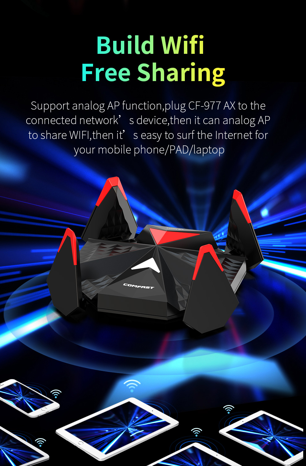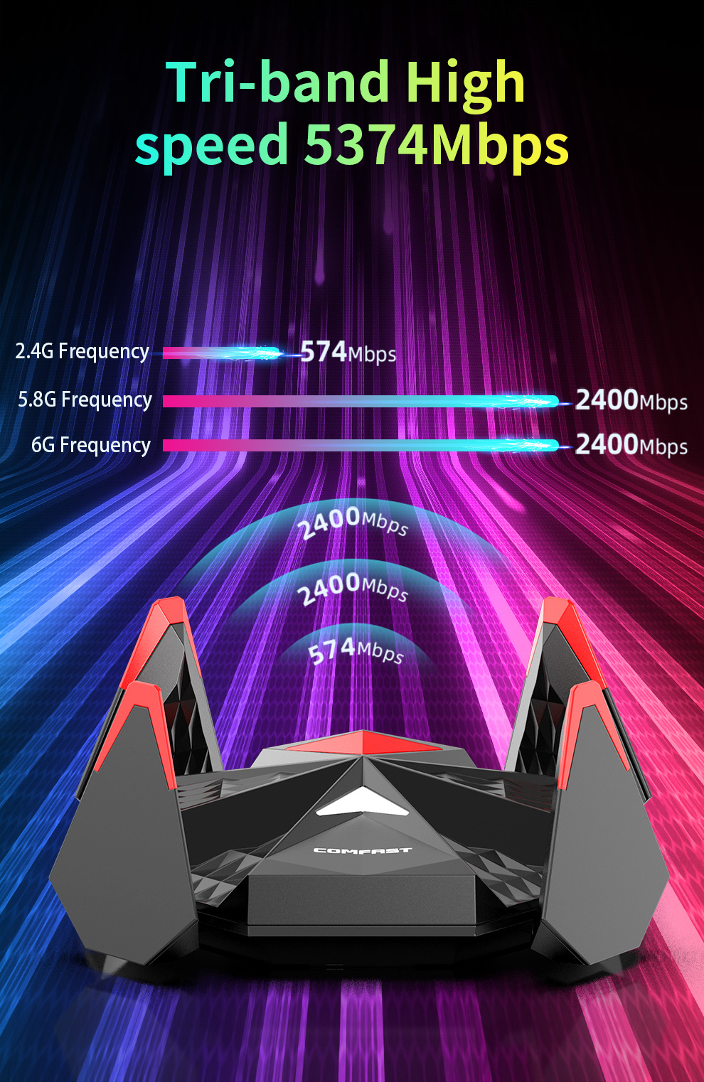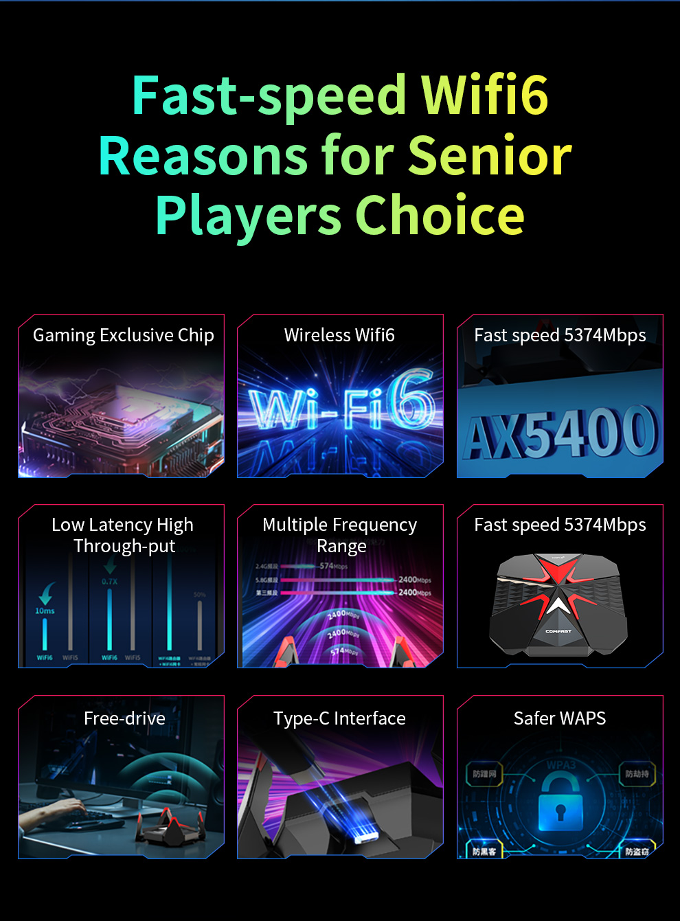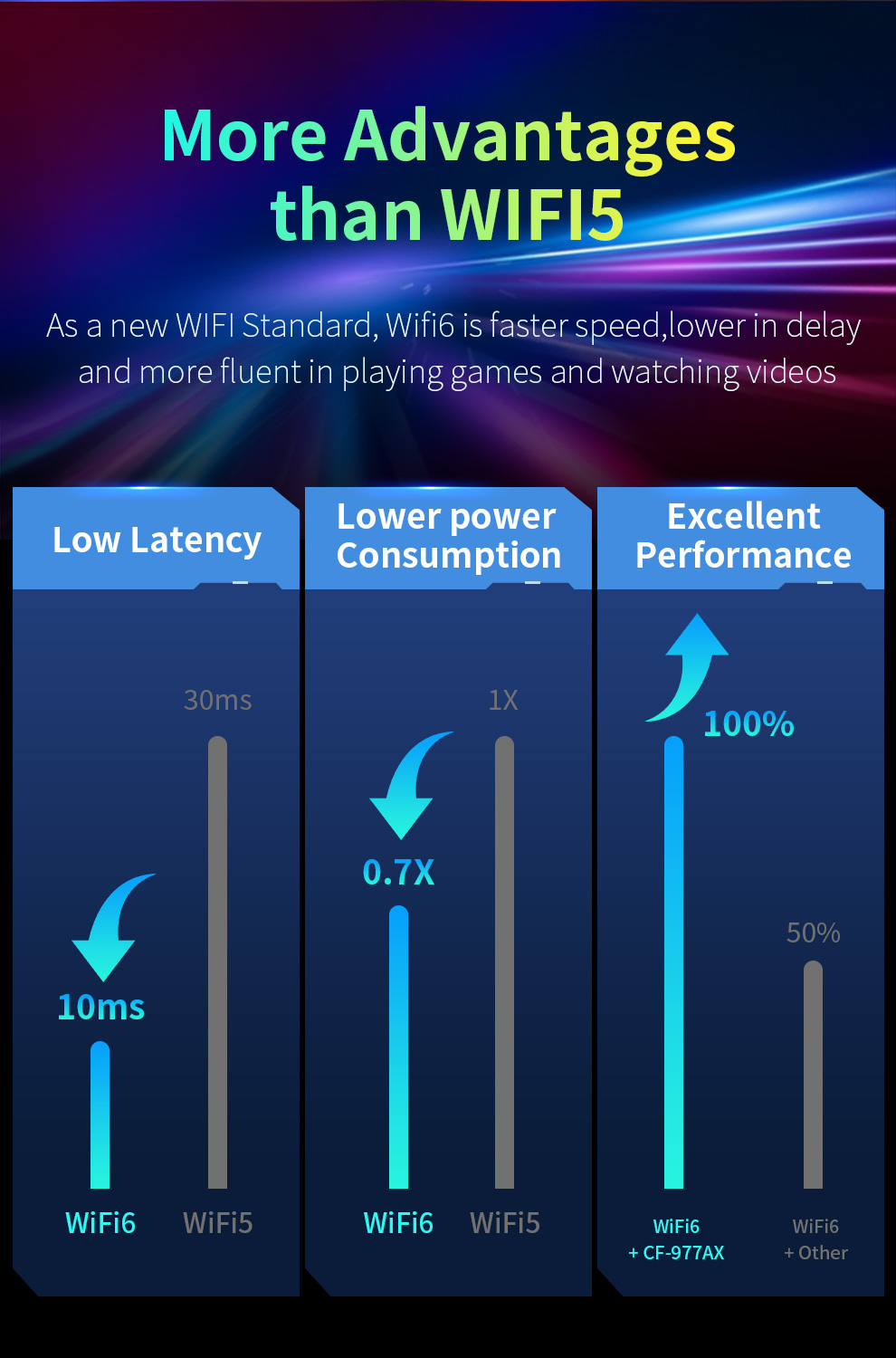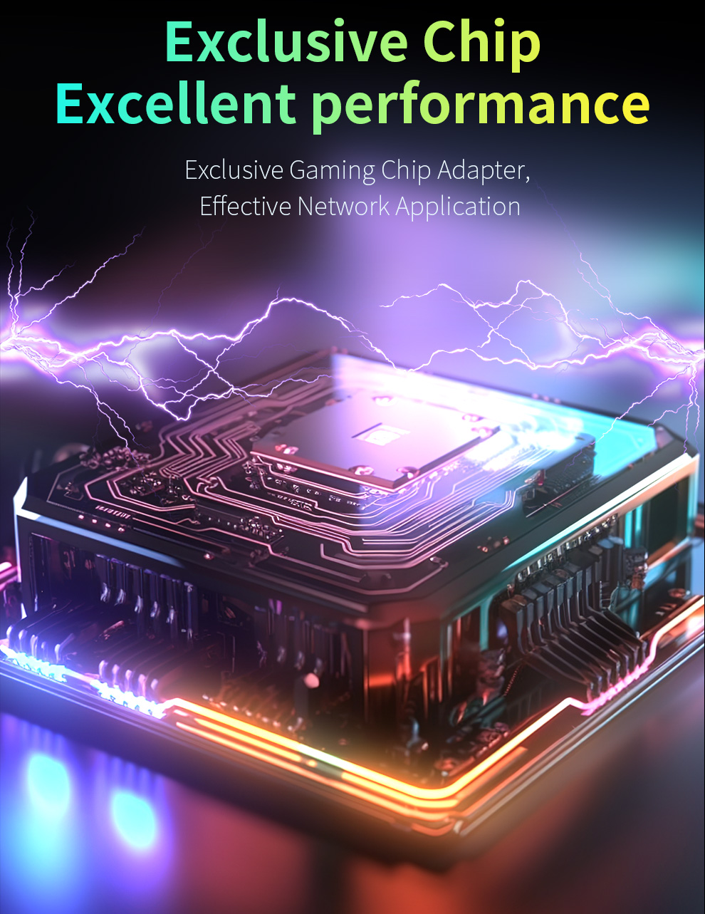 The CF-977AX is a driver-free tri-band WiFi6 adapter engineered for gaming, delivering blazing speeds up to 5374Mbps. It dramatically optimizes latency and interference for fluid, responsive gameplay in congested networks. Equipped with four external antennas for strong signals and a Type-C port with an extension cable for flexible placement, its plug-and-play design offers wide compatibility, making it a powerful upgrade for gaming and high-performance networks at home, in dorms, or the office.