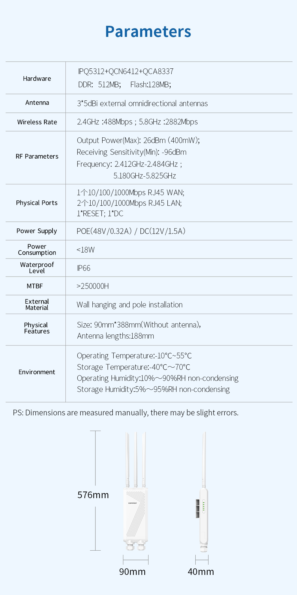 The CF-EW87 is a high-power outdoor wireless access point supporting the latest WiFi 7 standard, delivering up to 3600Mbps dual-band speed and extensive coverage. Its rugged IP66-rated housing and three high-gain omnidirectional antennas ensure stable, robust signals in harsh weather. With Mesh networking and dual PoE/DC power support for flexible deployment, it is an ideal solution for providing high-speed, seamless wireless coverage in large outdoor venues like squares, resorts, and scenic areas.