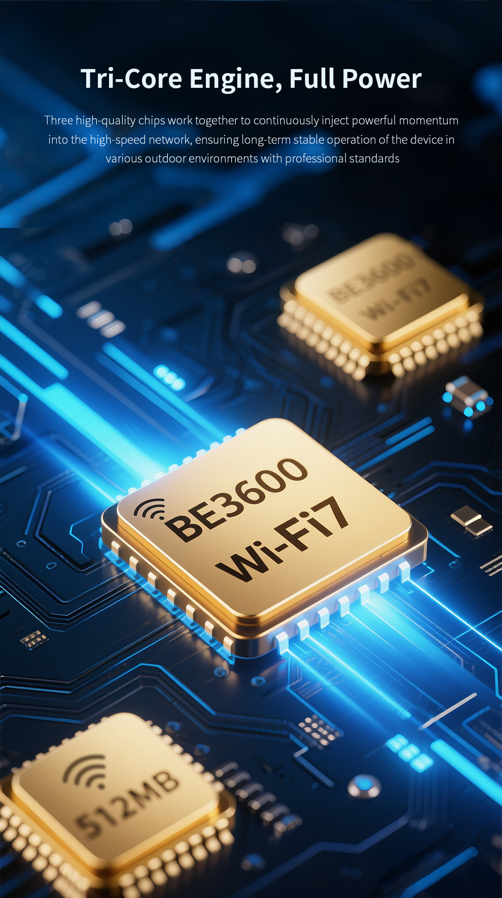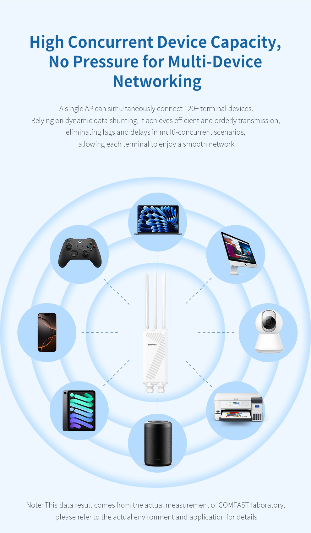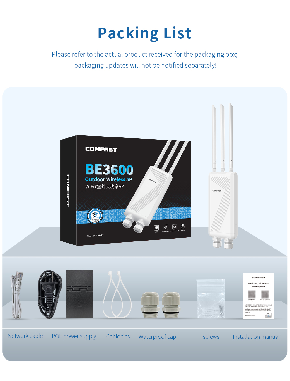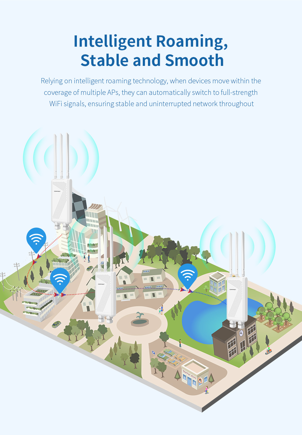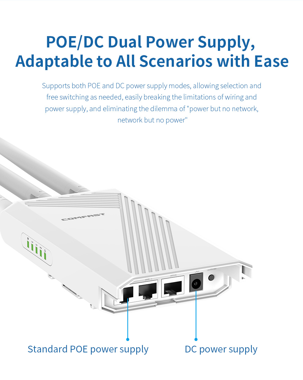 The CF-EW87 is a high-power outdoor wireless access point supporting the latest WiFi 7 standard, delivering up to 3600Mbps dual-band speed and extensive coverage. Its rugged IP66-rated housing and three high-gain omnidirectional antennas ensure stable, robust signals in harsh weather. With Mesh networking and dual PoE/DC power support for flexible deployment, it is an ideal solution for providing high-speed, seamless wireless coverage in large outdoor venues like squares, resorts, and scenic areas.