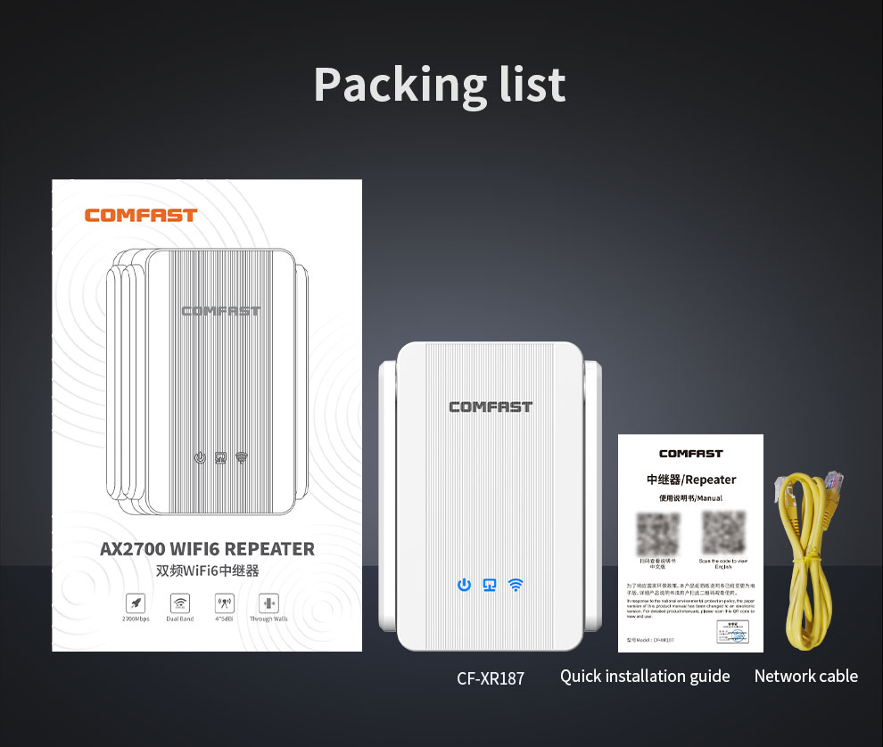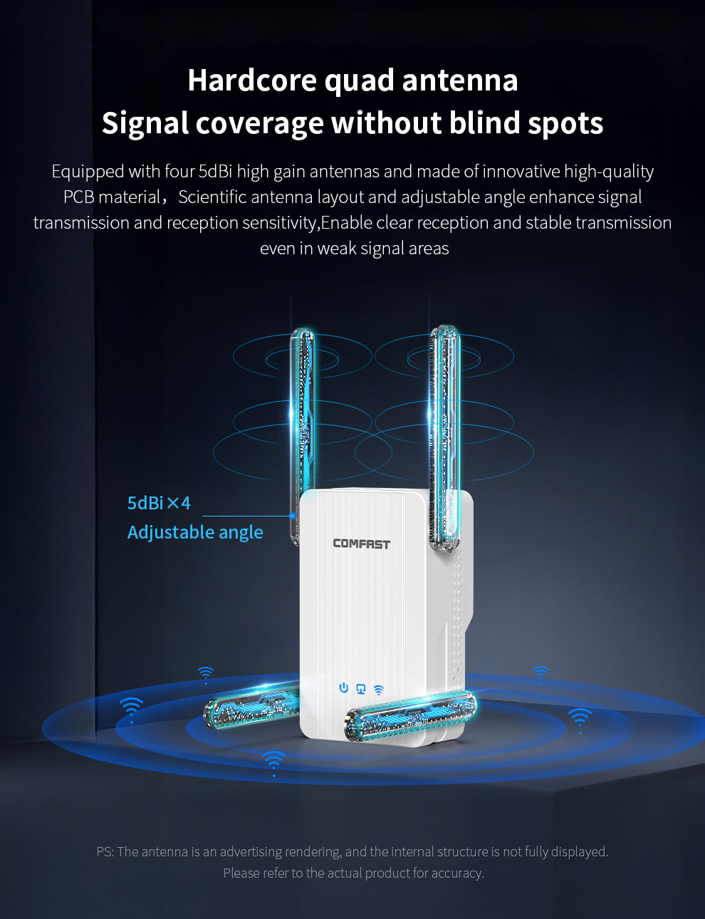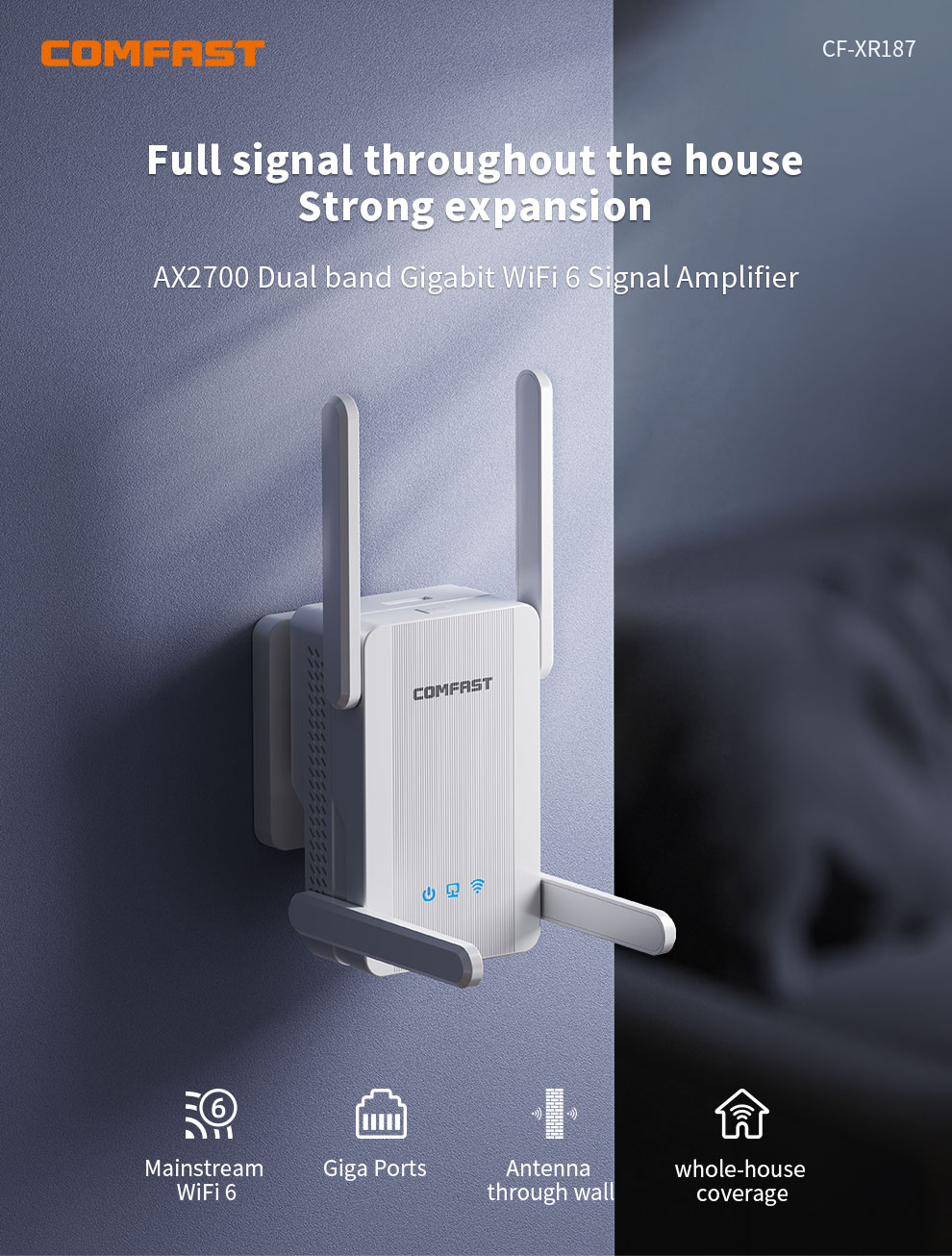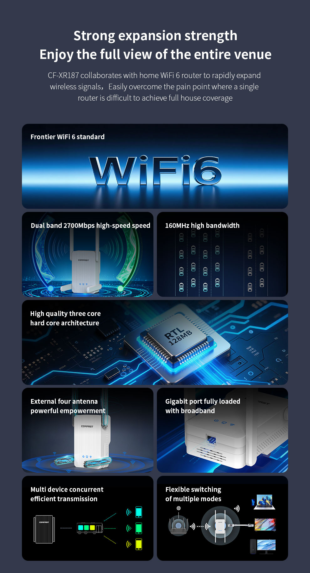 The CF-XR187 is a WiFi6 wireless extender designed to pair seamlessly with your router, delivering extended speeds up to 2700Mbps. Its four high-gain rotatable antennas and Gigabit Ethernet port enhance wall penetration and connection flexibility, effectively eliminating dead zones in large homes like villas. With easy setup and multiple smart operating modes, it’s a reliable choice for achieving seamless, high-speed whole-home coverage.