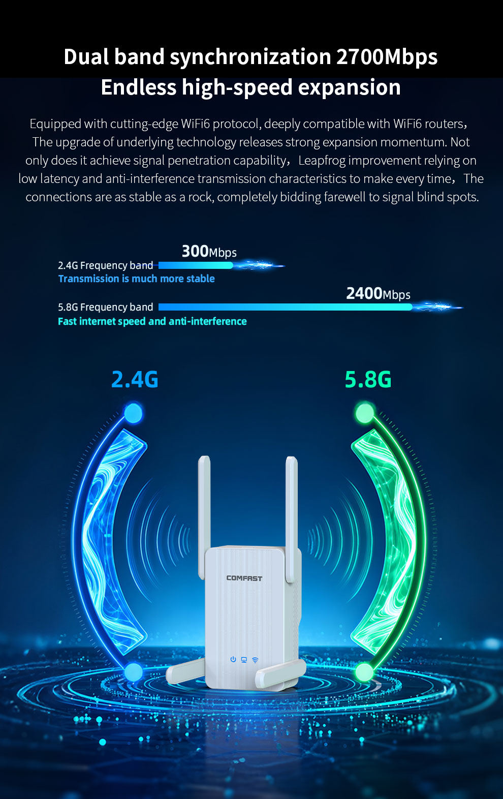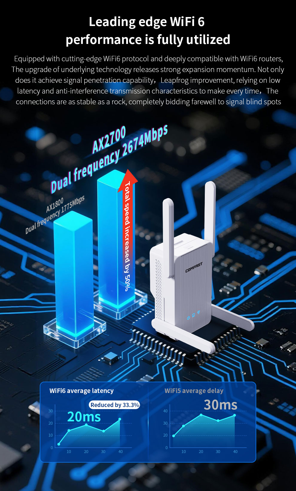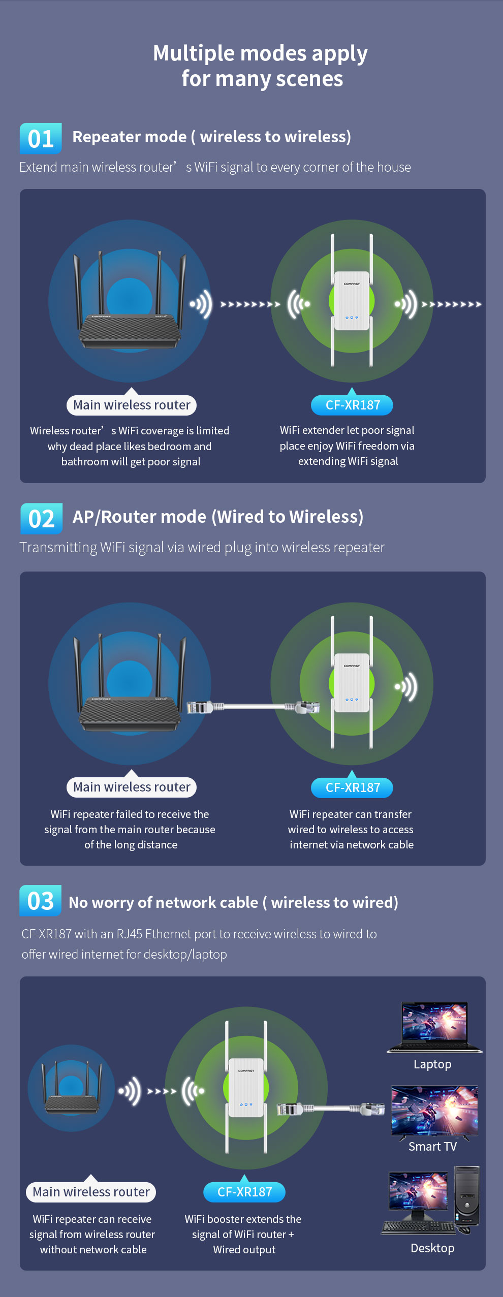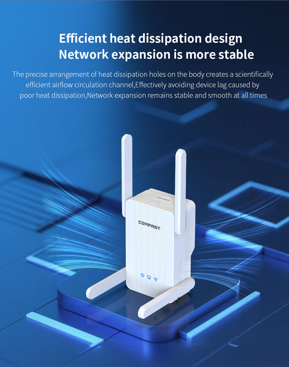 The CF-XR187 is a WiFi6 wireless extender designed to pair seamlessly with your router, delivering extended speeds up to 2700Mbps. Its four high-gain rotatable antennas and Gigabit Ethernet port enhance wall penetration and connection flexibility, effectively eliminating dead zones in large homes like villas. With easy setup and multiple smart operating modes, it’s a reliable choice for achieving seamless, high-speed whole-home coverage.