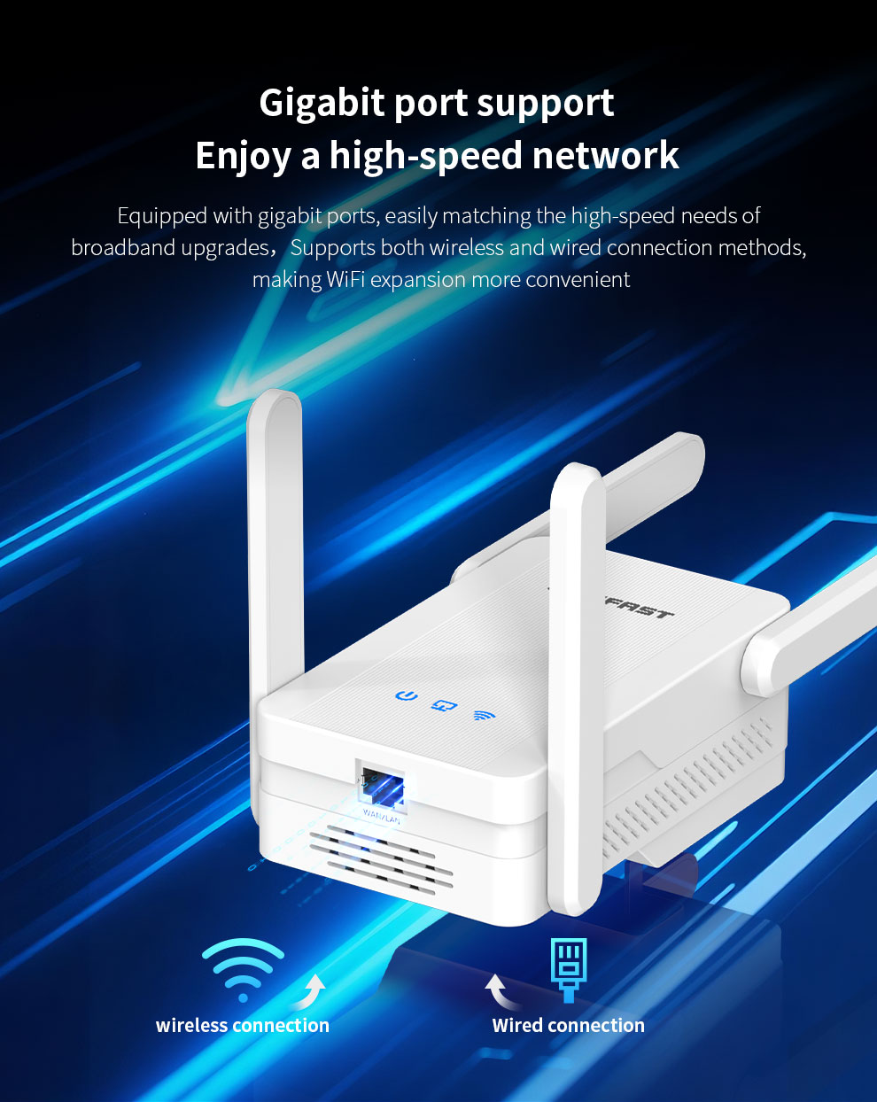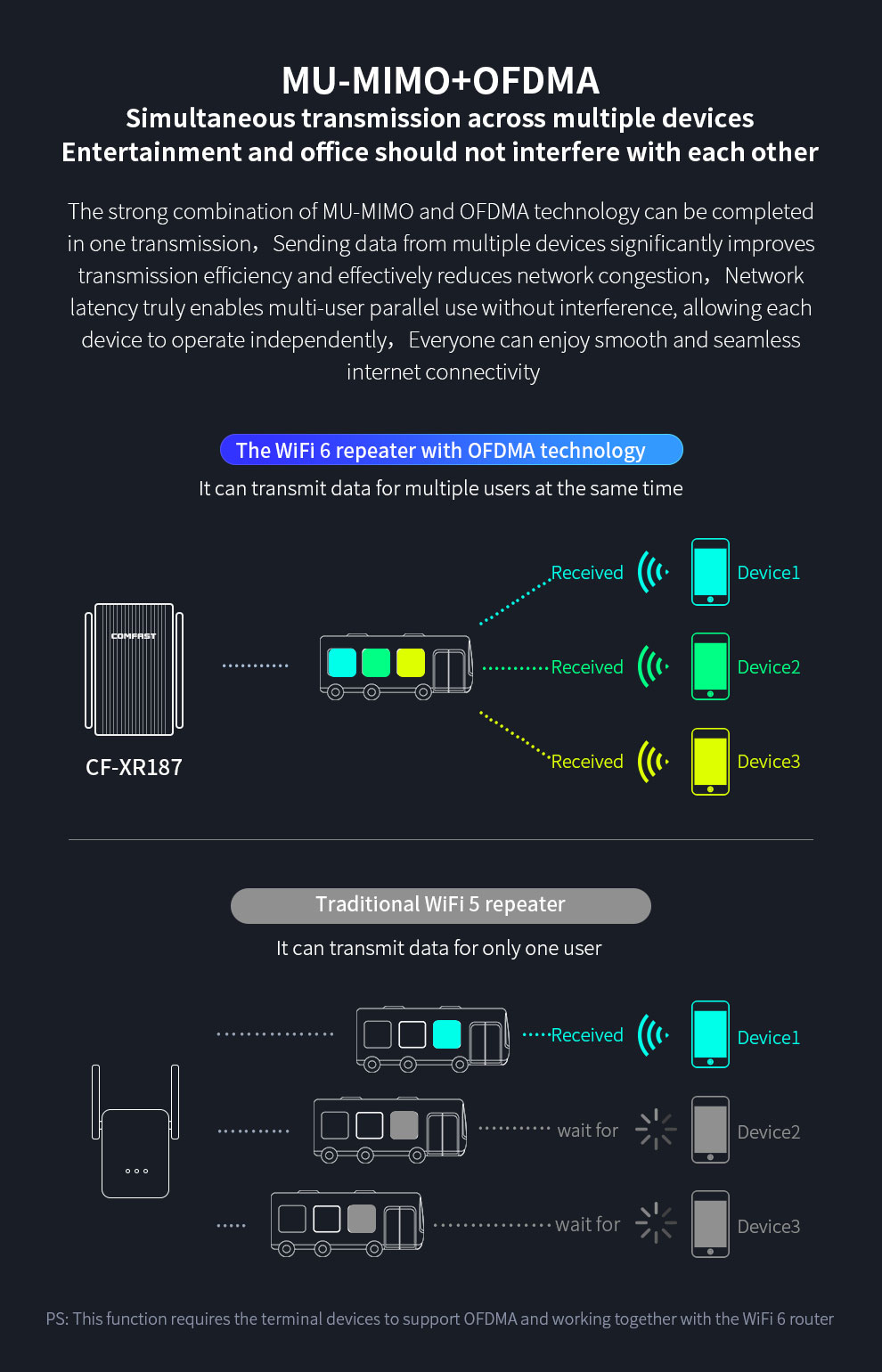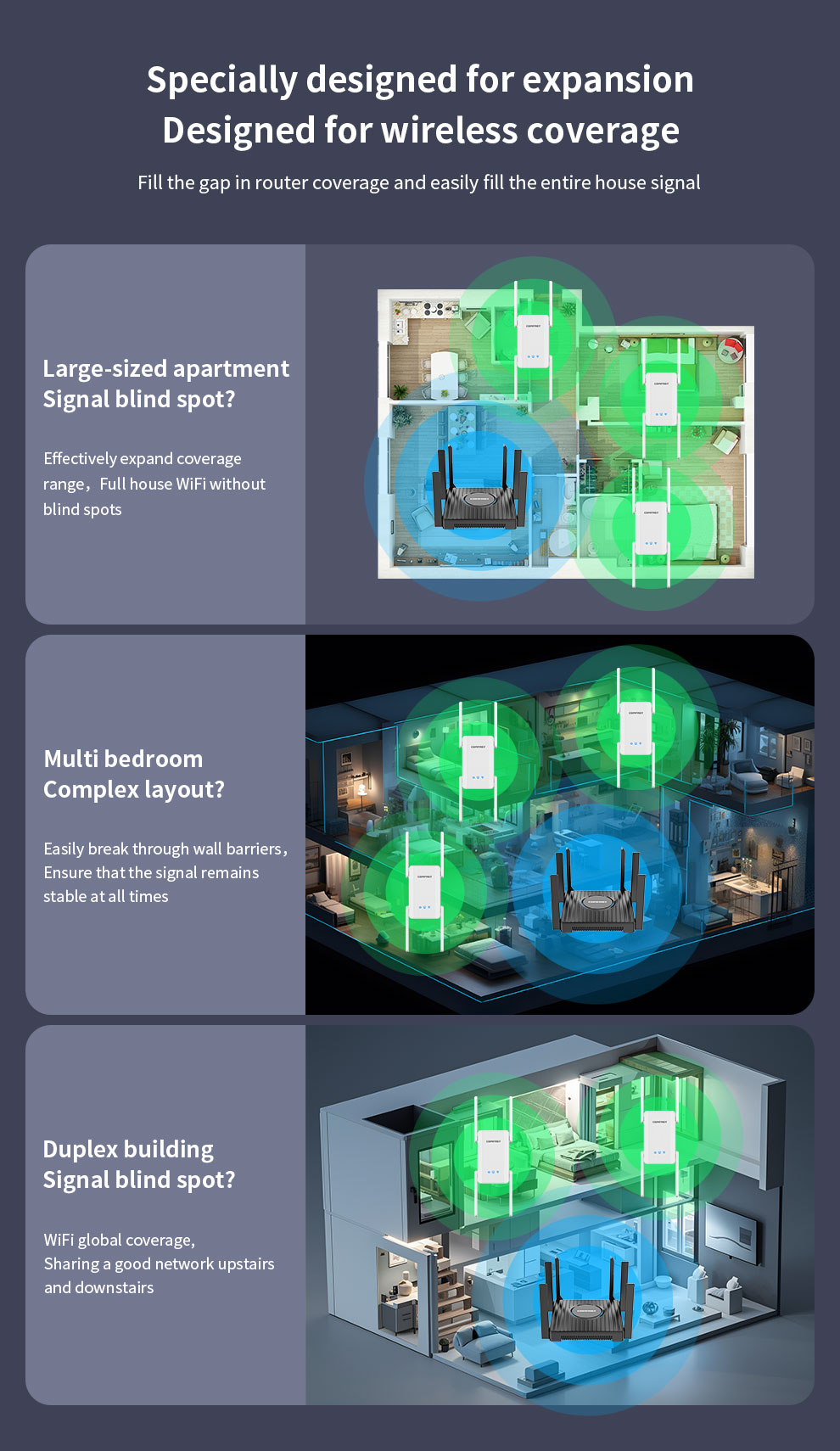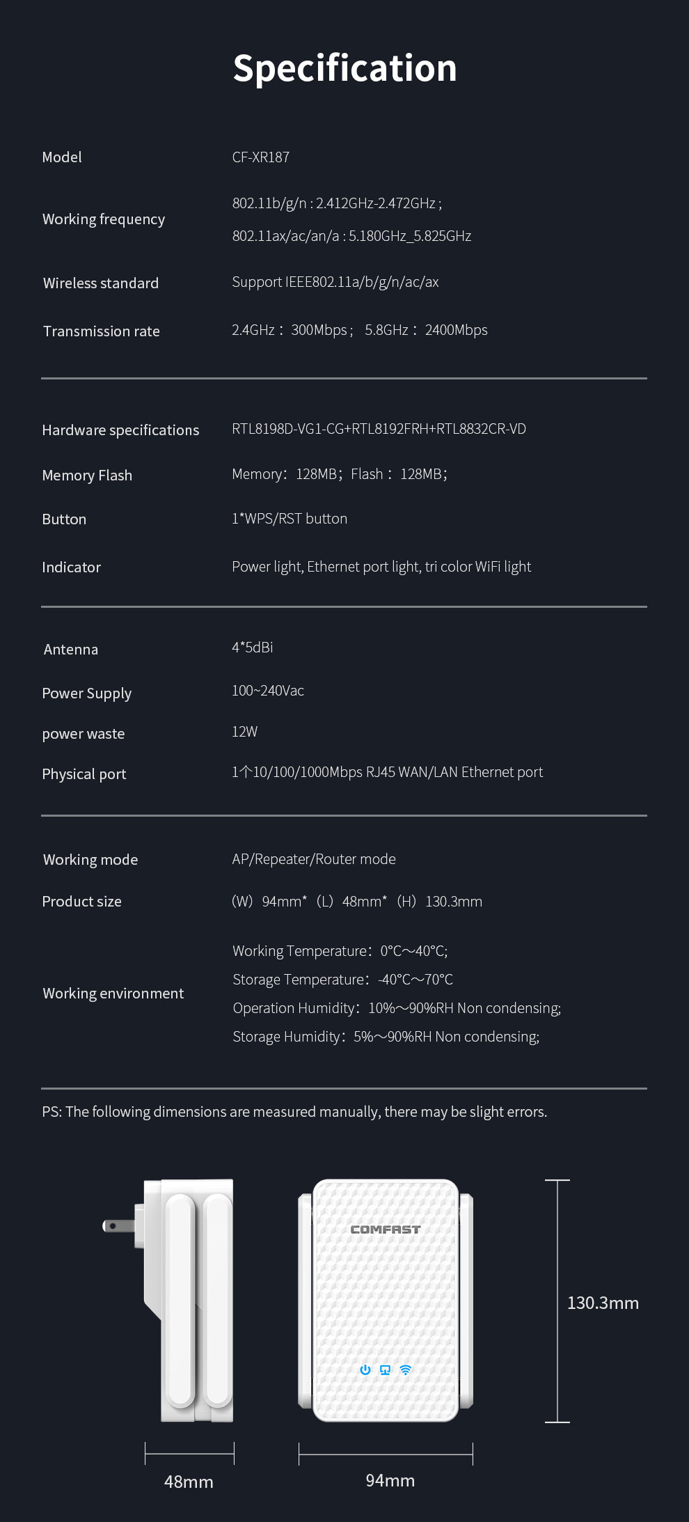 The CF-XR187 is a WiFi6 wireless extender designed to pair seamlessly with your router, delivering extended speeds up to 2700Mbps. Its four high-gain rotatable antennas and Gigabit Ethernet port enhance wall penetration and connection flexibility, effectively eliminating dead zones in large homes like villas. With easy setup and multiple smart operating modes, it’s a reliable choice for achieving seamless, high-speed whole-home coverage.